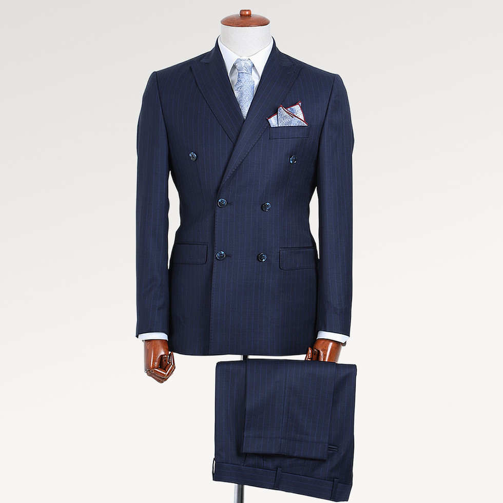 Présentation de notre costume croisé pour hommes qui respire une élégance et une sophistication intemporelles. Confectionné à la perfection, ce costume est orné de fines rayures et de revers en pointe, ajoutant une touche d'opulence à son design classique.